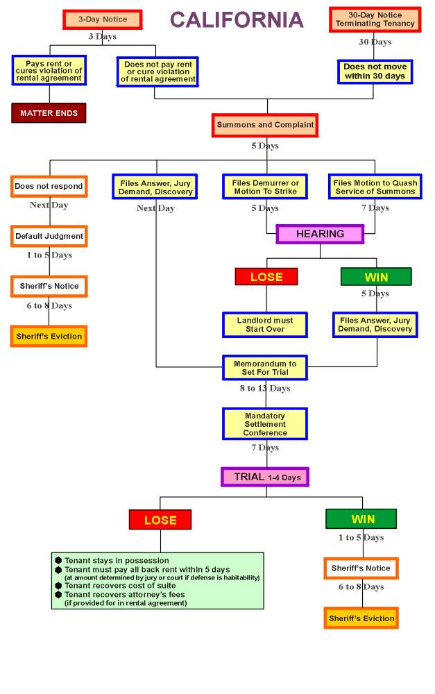 The following chart is based upon California law as of July 2000. You should check the appropriate current statutes for the correct procedures and time periods for California or any other state of interest. Also, since procedures and time periods can vary among different jurisdictions within the same state, it is advised that you check with the Court office in your jurisdiction.